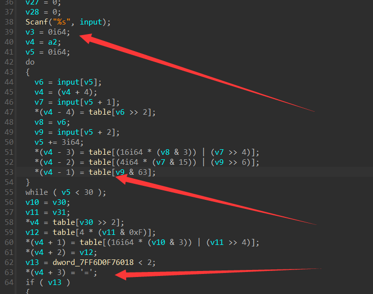 可以发现,就是通过换表的base64,进行加密的,我们可以再输入32个A,进行测试,通过两次调试结果我们可以发现,那一部分很花的代码,实现的效果就是将我们的输入补齐,补齐到32位,,由此,我们可以大致推测出,我们的flag的长度就是32位。